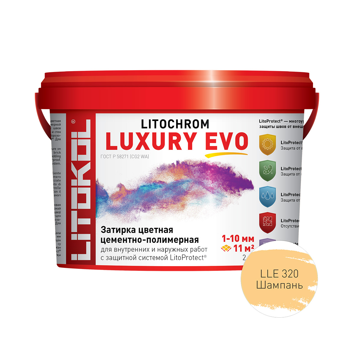 • LitoProtect® UV — защита от ультрафиолета. Благодаря специальной формуле все затирочные смеси LITOKOL LUXURY EVO имеют защиту от выцветания и изменений цвета при воздействии ультрафиолетового излучения в процессе эксплуатации.