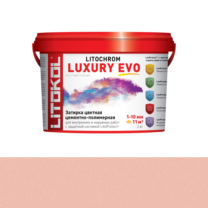 • LitoProtect® UV — защита от ультрафиолета. Благодаря специальной формуле все затирочные смеси LITOKOL LUXURY EVO имеют защиту от выцветания и изменений цвета при воздействии ультрафиолетового излучения в процессе эксплуатации.