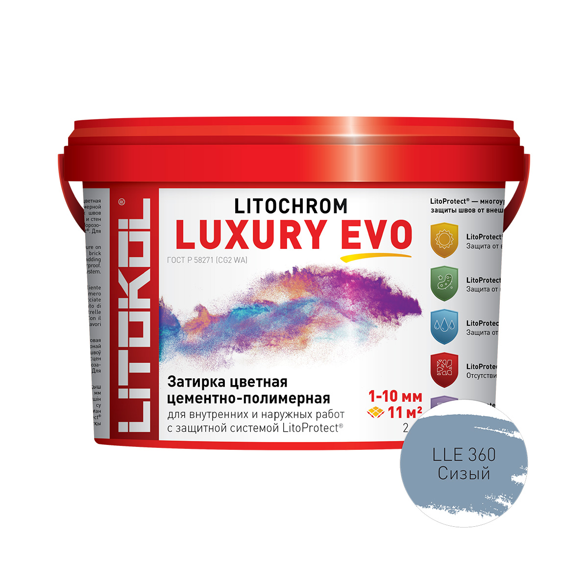 • LitoProtect® UV — защита от ультрафиолета. Благодаря специальной формуле все затирочные смеси LITOKOL LUXURY EVO имеют защиту от выцветания и изменений цвета при воздействии ультрафиолетового излучения в процессе эксплуатации.