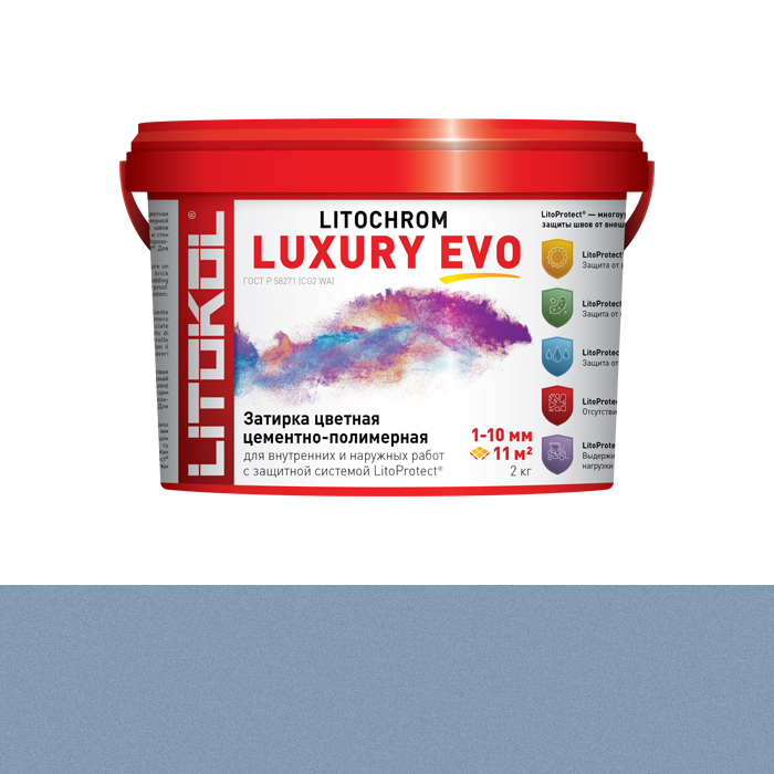 LITOKOL LUXURY EVO - эластичная водоотталкивающая цементно-полимерная фуга с защитной системой LitoProtect® для заполнения межплиточных швов шириной 1–10 мм включительно. Предназначена для затирки швов при облицовке стен и полов керамической плиткой, стеклянной мозаикой, керамогранитом, натуральным камнем, агломератом. LITOKOL LUXURY EVO относится к классу CG2WA согласно классификации ГОСТ Р 58271 (EN 13888) - цементная (С) затирочная смесь для межплиточных швов (G) с улучшенными техническими характеристиками (2) с пониженным водопоглощением (W), с повышенной стойкостью к истиранию (A).
